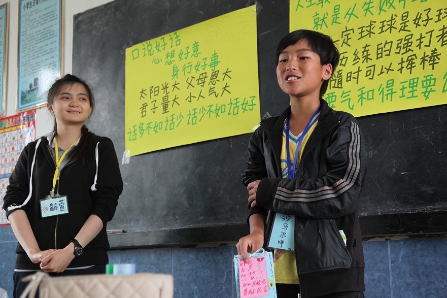 到了當地,我有點慌、有點緊張,我開始不知所措,但是當我站上台上,看著每一位小朋友純真的眼眸,還有那天真的笑容,我的心情不再那麼不安了,我放開自己、我用盡全力,將自己所能帶給他們的通通都拿出來。每一天我都期待清晨那一刻,因為在這全新的一天,我又能看見他們那純真的笑容;每一天我都期待晨操,看著他們各各從睡眼惺忪到充滿活力,是一件令人感到成就感和開心的事;每一天我都期待晨掃,因為打掃時間就是我們的談心時間;每一天我都期待上課,因為可以看見他們認真學習的模樣;每一天我都期待中餐,因為可以邊跟他們吃飯邊聊天,但是,每一天我都祈禱晚上不要來臨,因為晚上的來臨代表一天的結束,也代表我離開大營盤的時間將到了,每一天我都很珍惜,珍惜與攤們相處的短短時間,兩個禮拜的相處時間好長,但也好短,短到我每一天都覺得不捨,不想要那麼快分離,因為我知道也許分離後,以後就再也沒有見面的機會了,這是我們第一次見面,也許也是最後一次了,我們來自不同的地方,生活在不同的時空、接受不同的教育,也說著不同的語言,但我們卻不因此而有距離,在這兩個禮拜,我能感受到他們把我當成他們的家人,而同時,在這兩個禮拜,我也將他們視為自己的弟弟妹妹,但是,總會離別,不過離別不會將彼此的情感與緣分阻隔的。
